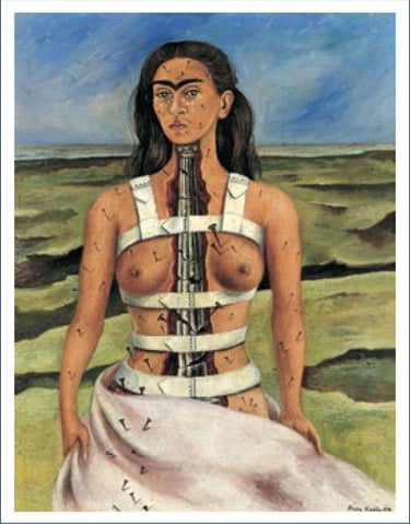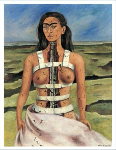 En La Columna Rota, la artista representa su cuerpo desgarrado y quebrantado, sustituyendo su columna vertebral por una columna jónica agrietada, un símbolo de cómo ella percibía su salud física y mental.